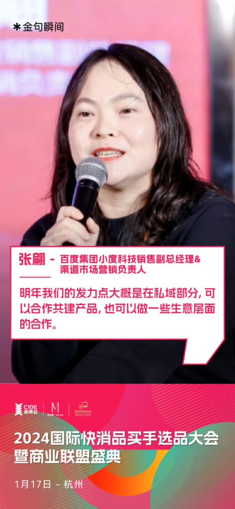 百度集团小度科技销售副总经理&渠道市场营销负责人张翩:我们在公域层面现在做的规模是相对比较大的,但是在私域这一块,我们更多的判定点是规模没有突破很大。所以在2024年会大力布局做私域运营。